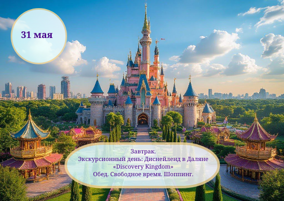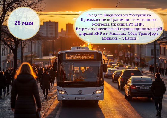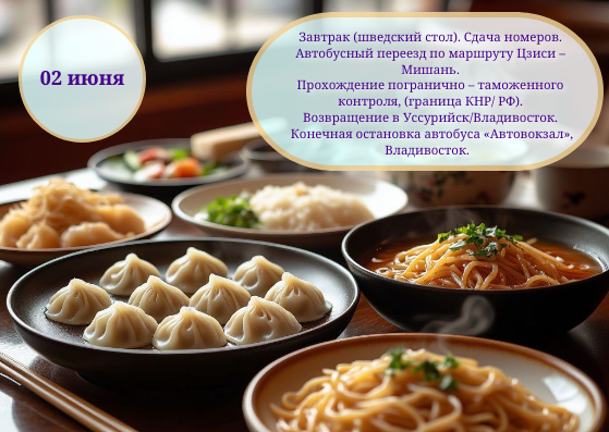 В стоимость входит:Трансфер Владивосток/Уссурийск – Мишань/Цзиси – Далянь и обратно (по программе). Проживание в гостинице 3* (2 х местное, другое размещение по предварительным запросам). Питание по программе. Экскурсии. Участие в фестивале-конкурсе. Услуги переводчика (встреча, проводы, сопровождение, решение вопросов).