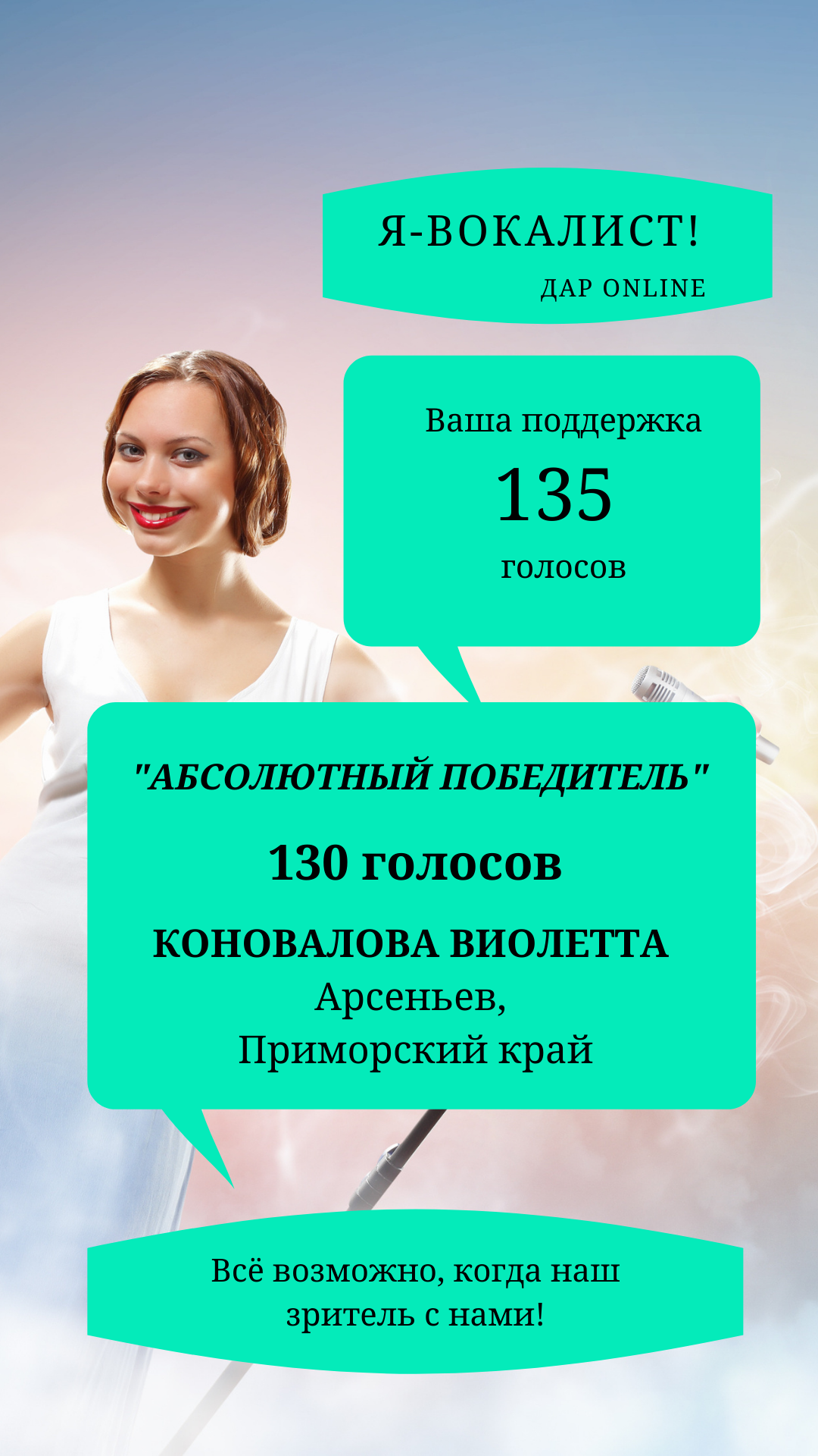 Номинация «Я – ВОКАЛИСТ» представлена КОНОВАЛОВОЙ ВИОЛЕТТОЙ, из Арсеньевского городского округа, Приморский край.