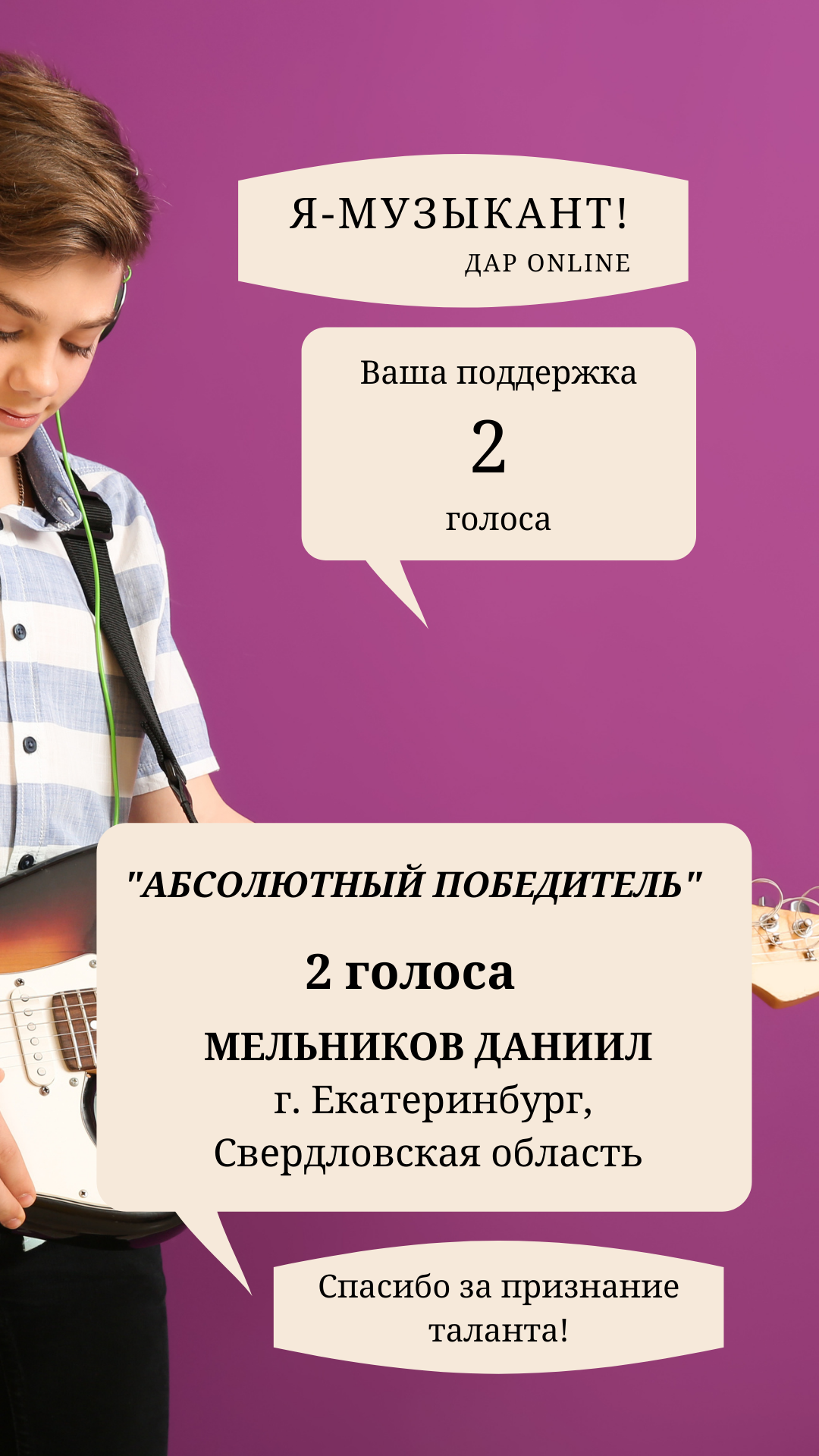 Номинация «Я – МУЗЫКАНТ» представлена МЕЛЬНИКОВЫМ ДАНИИЛОМ из города Екатеринбурга Свердловской области.