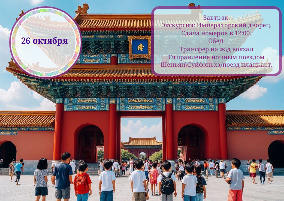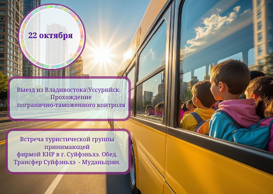 Трансфер Владивосток/Уссурийск – Суйфэньхэ/Муданьцзян – Шеньян и обратно (по программе). Проживание в гостинице 3* (2 х местное, другое размещение по предварительным запросам). Питание по программе. Экскурсии. Участие в фестивале-конкурсе. Услуги переводчика (встреча, проводы, сопровождение, решение вопросов).