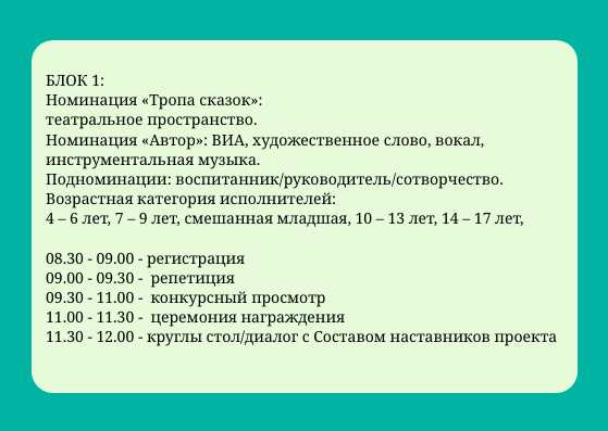 Возрастная категория исполнителей: 4 — 6 лет, 7 – 9 лет, 10 – 13 лет, 14 – 17 лет, 18 – 21 год, 22 – 25 лет, 26 – 30 лет, 31 – 35 лет, старше 36 лет, смешанная.