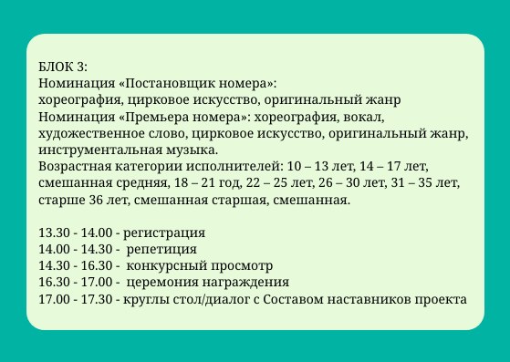 Представляют на конкурсный просмотр один конкурсный номер, продолжительность не более 4 минут.