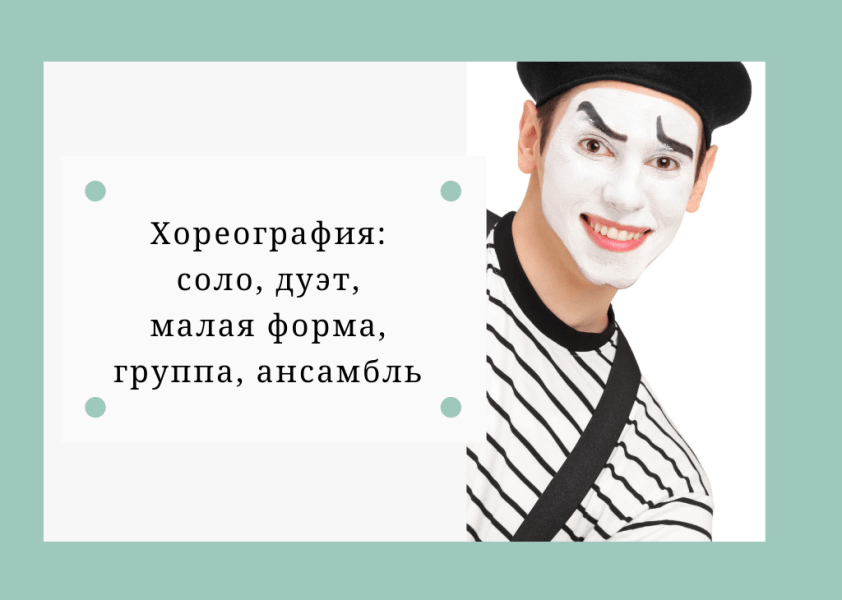 Детский танец, Народно-стилизованный танец, Деми-классика, Хореографическая миниатюра, Патриотический танец, Степ-джаз-чечетка, Танцевальное оформление эстрадного номера, Танцевальное шоу, Душой исполненный полет/эстрадный номер на основе художественной гимнастики, акробатики, классического танца, бального танца – все, что выходит за рамки жанров хореографического искусства – поиск, эксперимент, творческий синтез жанров/.