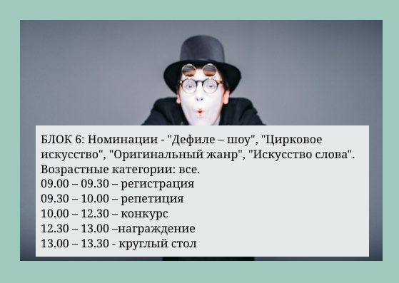 Участники могут представить на конкурсный просмотр от 1 до 3 конкурсных номеров, продолжительность каждого номера не более 5 минут.